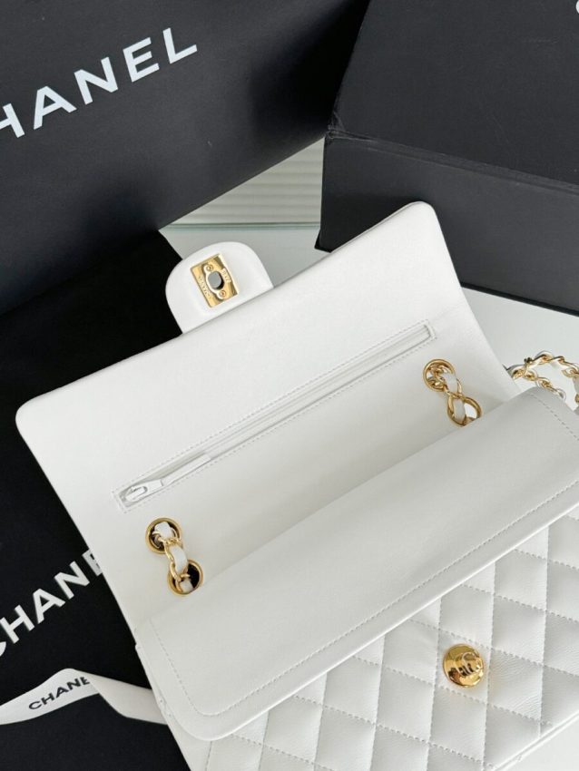 Crafted from quilted lambskin or Caviar leather, this double flap bag replicates every defining detail of the authentic Chanel Classic Flap with expert precision. The blanc lambskin exterior is paired with gold-tone or ruthenium interlocking CC turn-lock hardware, featuring CC turn-lock with double flap. Hand-finished seams and precision stitching reflect the heritage of Parisian elegance with timeless quilted luxury.