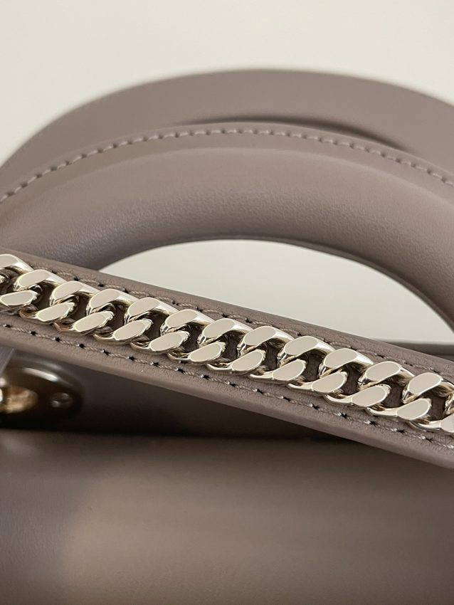 Crafted from cannage quilted lambskin leather with signature Cannage stitching in the mini 17cm format, this structured top-handle bag replicates every detail of the authentic Christian Dior Lady Dior with meticulous precision. The beige powder leather exterior is elevated by antique gold-tone ‘D.I.O.R.’ letter charms and feet hardware, featuring magnetic snap closure under a flap front. Hand-finished stitching and even seam lines reflect the Maison’s Parisian atelier standards.